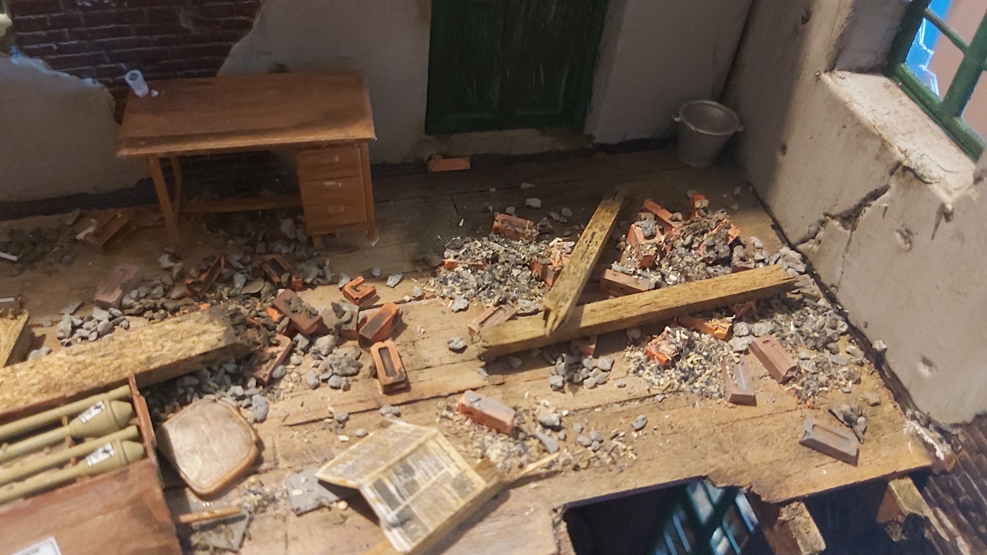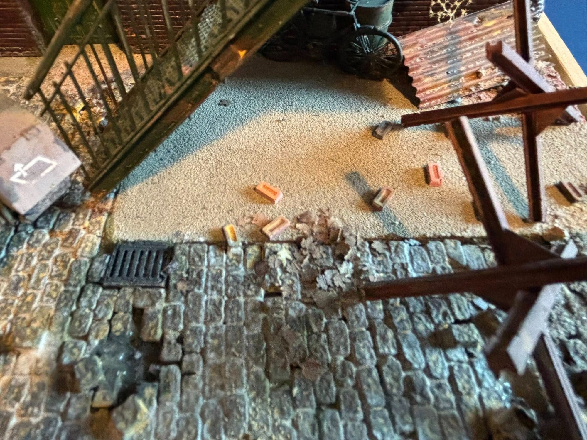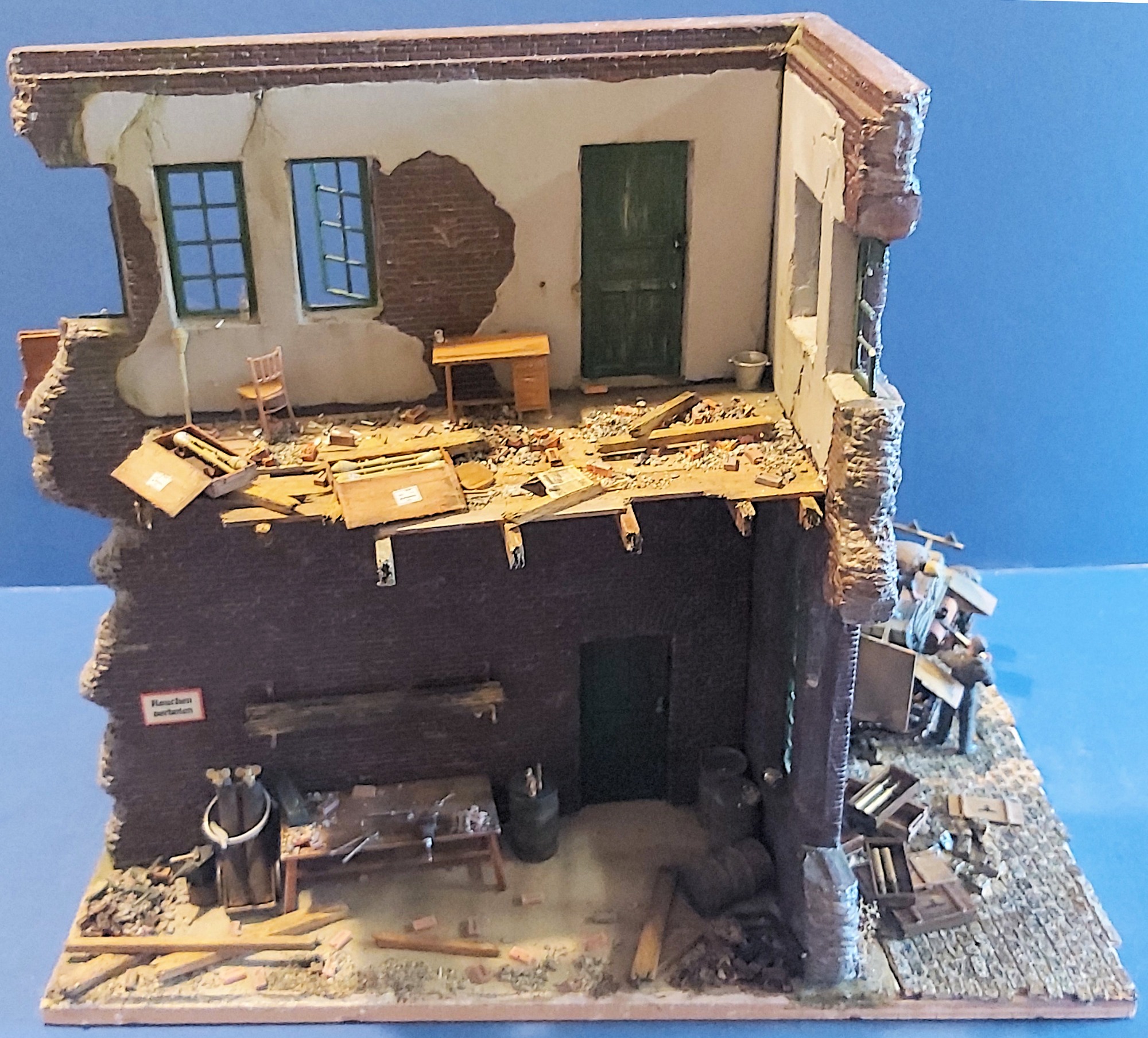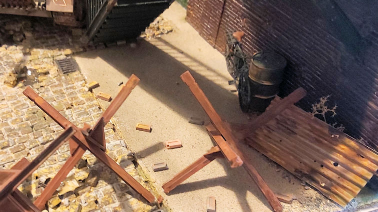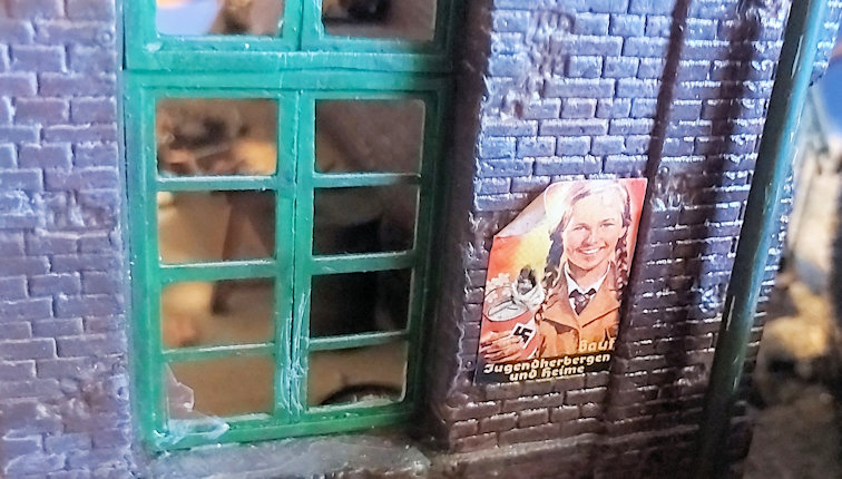 This small diorama uses Cobbles, Bricks Wood Debris, German Posters, German Newspapers, German Documents, Scenic adhesive. and a custom sign