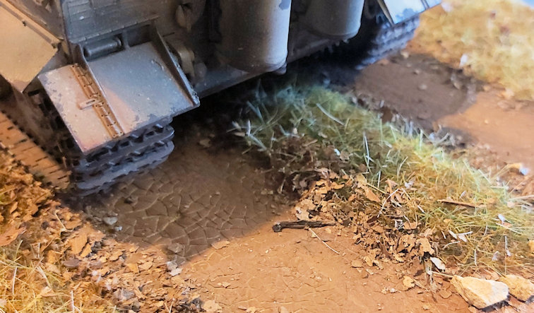 Close up showing the road surface created with our Dirt Road Terrain Paste and Forest Floor Mix Scatter.